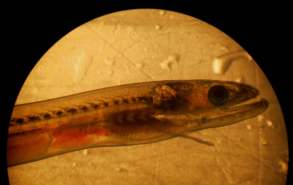 C’est une civelle au stade 1 ! La larve d’Anguille traverse l’Océan Atlantique Nord en moins d’un an depuis son mystérieux lieu de naissance, la Mer des Sargasses. Arrivée aux côtes, elle se métamorphose en civelle. Capturée, endormie, sa pigmentation est déterminée grâce aux pigments naissants sur sa tête et son corps. Plus les pigments sont nombreux sur le dos, plus la civelle est avancée dans son développement, plus elle est « âgée », sa migration terminée et prête à s’installer. Sur cette photo, nous observons peu de pigments.