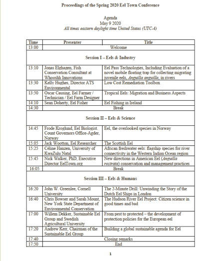Eel Town rassemble les sympathisants des anguilles que ce soit des experts, scientifiques, pêcheurs ou amateurs et est un lieu d’échanges d’informations diverses et variées sur l’anguille. La communauté Eel Town a organisé sa première conférence le 9 mai 2020 dernier en visioconférence ! C’était une chance d’assister gratuitement à une conférence scientifique. Le programme était riche, la conférence a duré 5h, les sujets des conférences étaient variés et les conférences très enrichissantes.