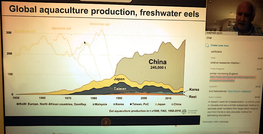Andrew Kerr nous a ensuite présenté les principaux éleveurs d’anguilles dans le monde (élevées après avoir été prélevées du milieu naturel) d’après les données de la FAO, les principales voies d’exportation des marchés mondiaux du commerce des anguilles et les chiffres globaux du commerce illégal d’anguilles.